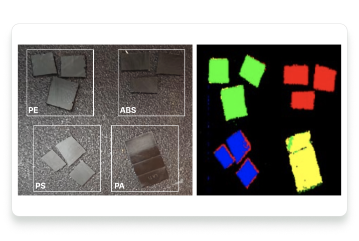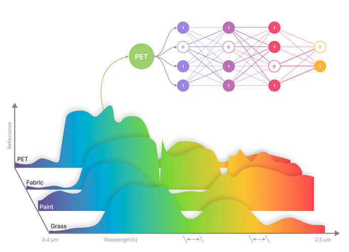 초당 670 프레임으로 고속 라인스캐닝한 근적외 (900-1700nm) 대역을 최대 224개 밴드로 고해상도 분광분석하는 모델은, 단순히 객체의 크기와 모양을 근거로 추론하는 sRGB 방식 대비 혁신적으로 성능이 개선된, 99.9%의 정확도로 폐기물의 재질을 검출합니다.