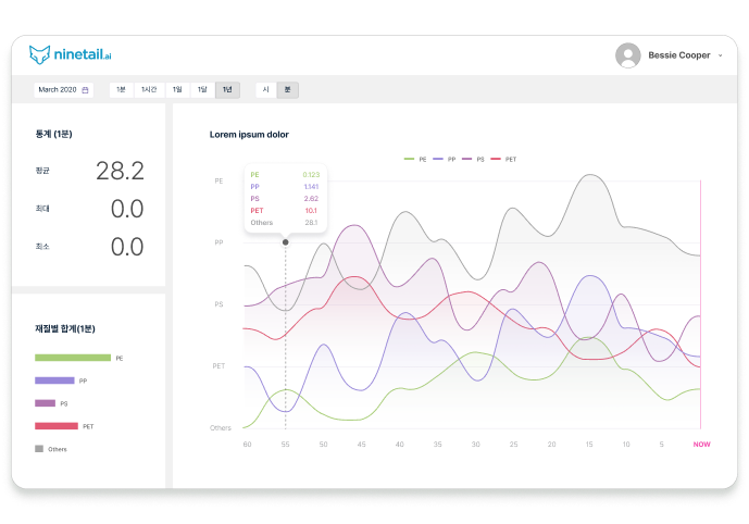 복수의 FoxVision 노드를 선별 파이프라인의 각 구간에 배치할 경우, 유입물과 최종 폐기물 정보는 물론, 각 재질 라인 별로 선별된 재활용품과 폐기물의 수량/종류에 대한 통계 정보를 통합 대시보드에서 확인할 수 있습니다.